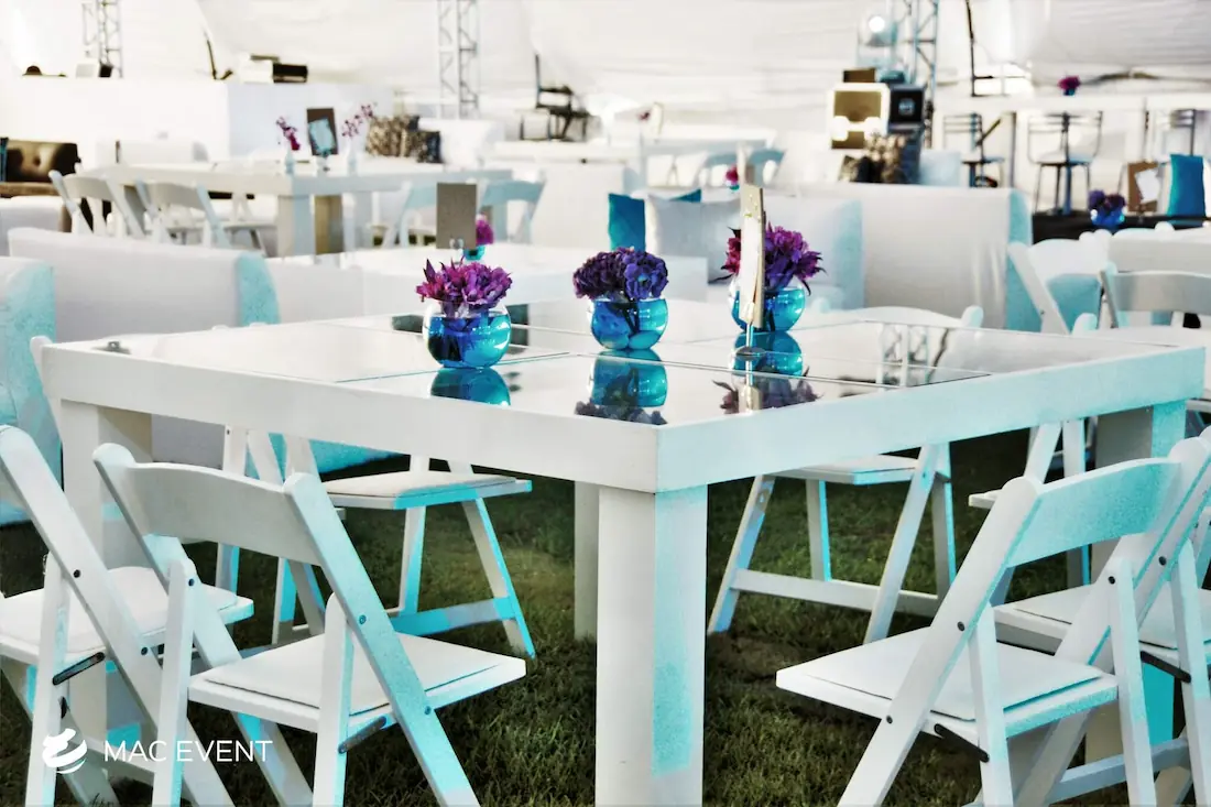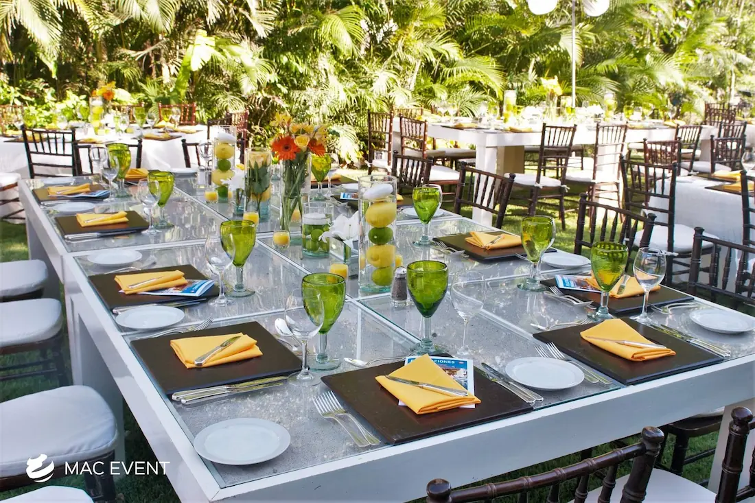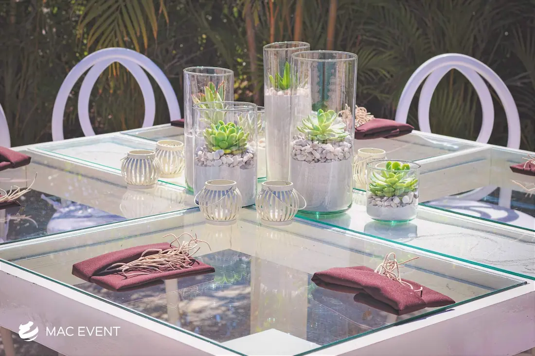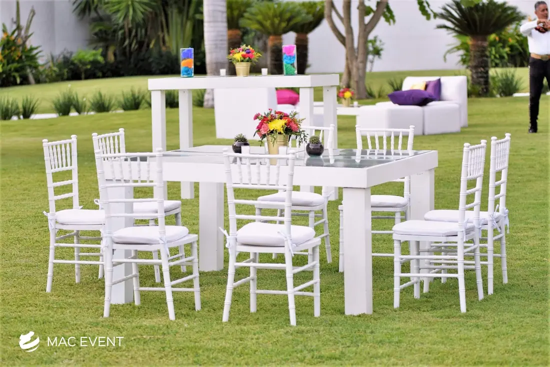 The wooden glass table combines natural elegance with a modern touch, making it perfect for weddings, parties, and corporate events in Riviera Maya. Its wooden frame adds warmth, while the glass top provides a sleek and sophisticated finish that complements any décor style. This event table rental works beautifully for dining areas, sweetheart setups, or display tables, creating a refined and inviting look. Renting wooden glass tables in Riviera Maya ensures a polished presentation with durability and style. For an event that blends rustic charm with contemporary design, the wooden glass table is an exceptional choice.